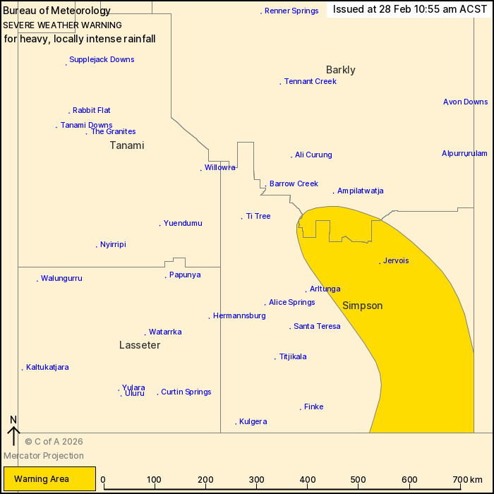 Weather Situation: A tropical low is positioned about the southwest Simpson district, and is expected to gradually track southwards into South Australia into this evening. Rich tropical moisture on the eastern flank of this system is bringing a risk of heavy to locally intense rainfall.