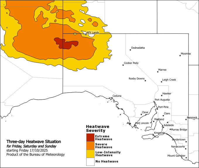 Maximum temperatures in the high thirties to mid forties and overnight minimum temperatures in the low to high twenties in the northwest this weekend. The heat is expected to peak over the weekend and ease early next week. Locations likely to be impacted include APY Lands and Oak Valley.