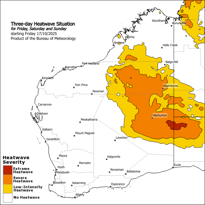 Maximum Temperatures in the high thirties to mid forties and overnight minimum temperatures in the low to high twenties over parts of the Interior. The heat is expected to peak over the Interior this weekend and ease early next week. Although severe heatwave conditions have eased in the Kimberley, low intensity heatwave conditions are expected to persist into next week. Locations likely to be impacted include Kiwirrkurra and Warburton.
