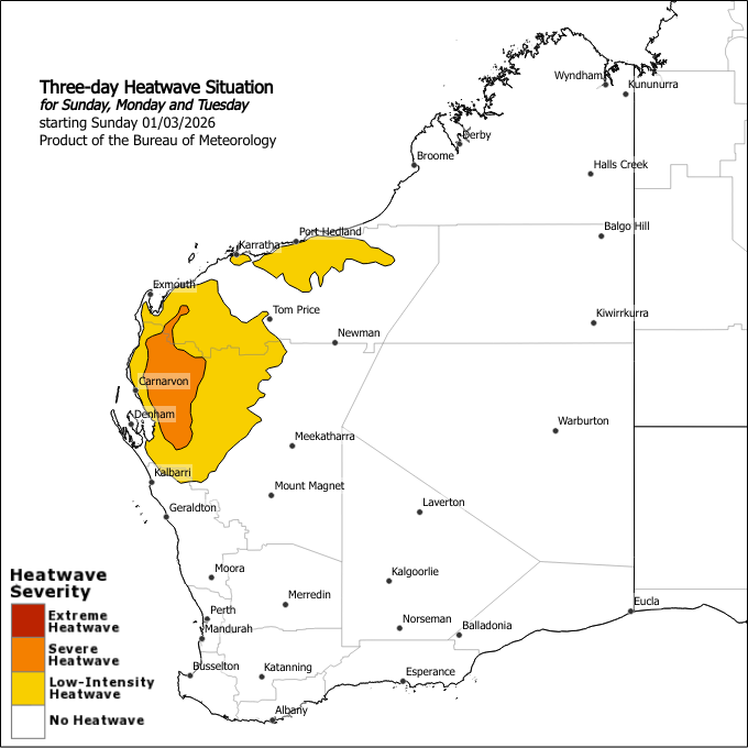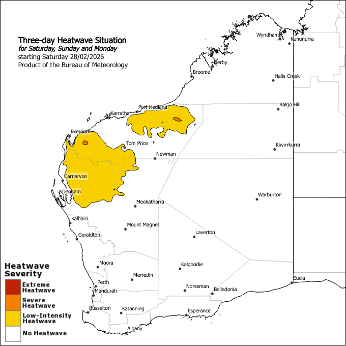 Maximum temperatures ranging from the high thirties to the mid forties. Overnight minimum temperatures ranging from the low to mid twenties will increase to the mid to high twenties by the start of the new week. Severe heatwave conditions over the western Gascoyne are expected to persist through the next week.