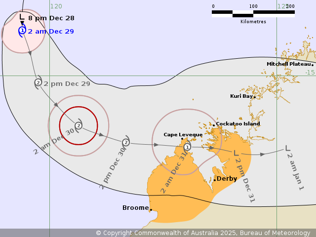 Location: within 45 kilometres of 14.0 degrees South, 119.4 degrees East, 535 kilometres northwest of Broome, 590 kilometres northwest of Derby